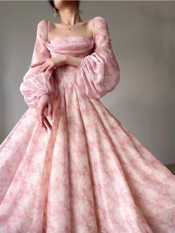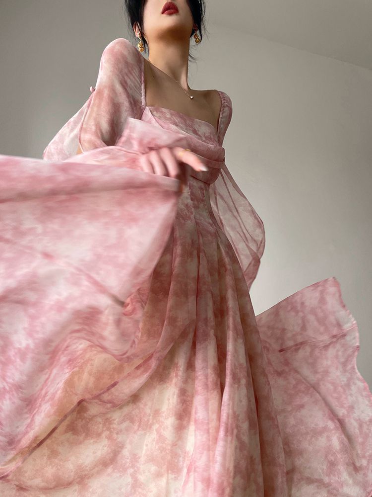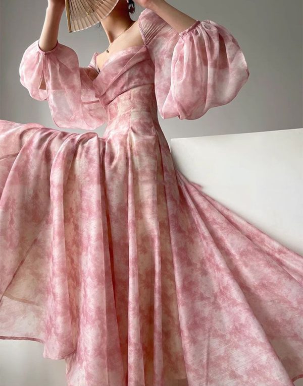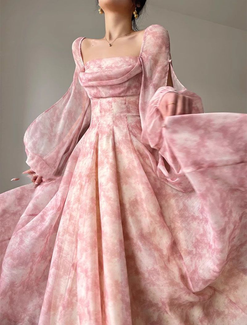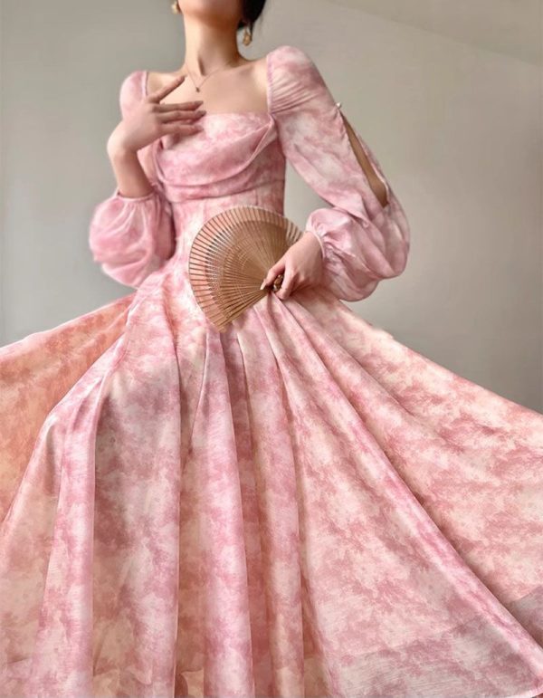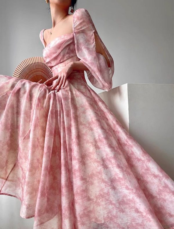 / Fairy Y2K Draped Ruch Floral Midi Tea Party Dress With Split Sleeves